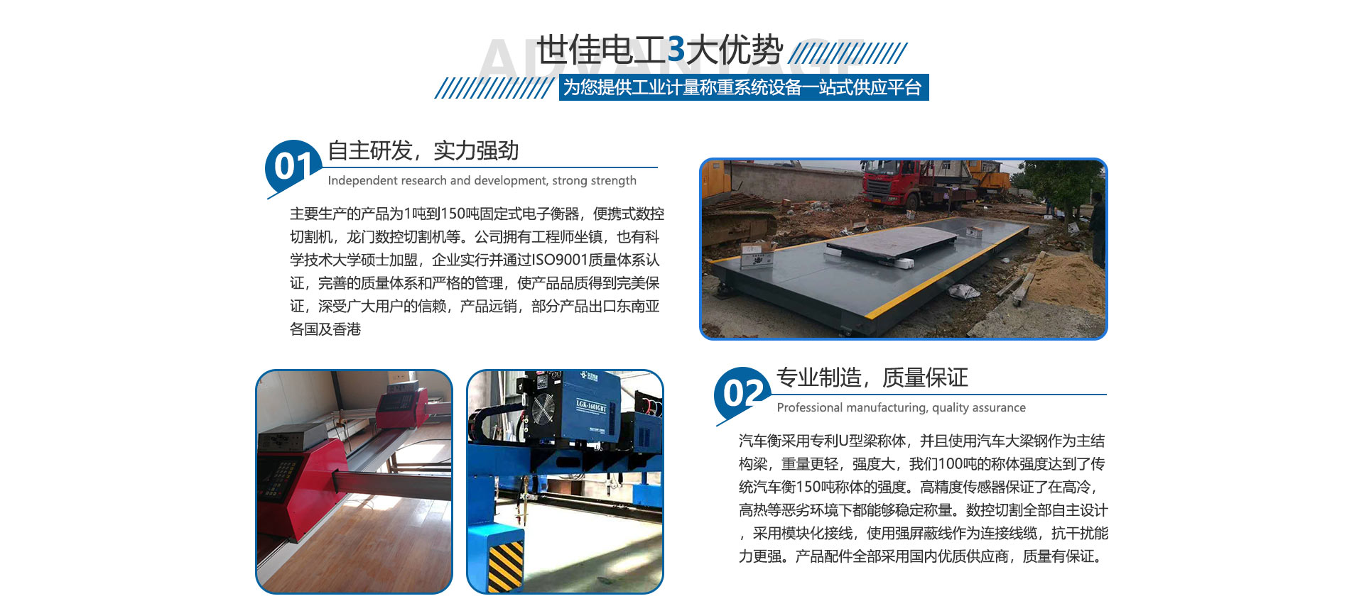 關于我們合肥世佳電工設備有限公司是生產、銷售工業(yè)自動化設備。主要生產的產品為1噸到150噸固定式電子衡器,便攜式數(shù)控切割機,龍門數(shù)控切割機等。公司擁有工程師坐鎮(zhèn),也有中國科學技術大學碩士加盟,完善的質量體系和嚴格的管理,使產品品質得到保證,深受廣大用戶的信賴,產品各地可售,部分產品出口東南亞各國及香港,數(shù)控切割設備也在安徽處于前列。我們并不滿足現(xiàn)在所取得的成就,公司繼續(xù)加大科研投入,正在和中科大物理研究所科研人員共同研究開發(fā)下一代衡器控制儀表,希望以技術作為突破口,將公司做大做強,為中華崛起盡自己一份綿薄之力。歡迎廣大客戶來廠參觀訂貨考察。